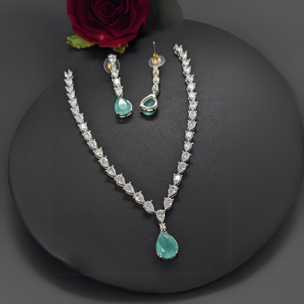 Add a touch of luxury to your look with this dazzling sapphire necklace and earring set. The set features a stunning sapphire pendant, surrounded by sparkling cubic zirconia. The earrings feature a matching sapphire and cubic zirconia design. This set is perfect for a night out on the town or for a special occasion.